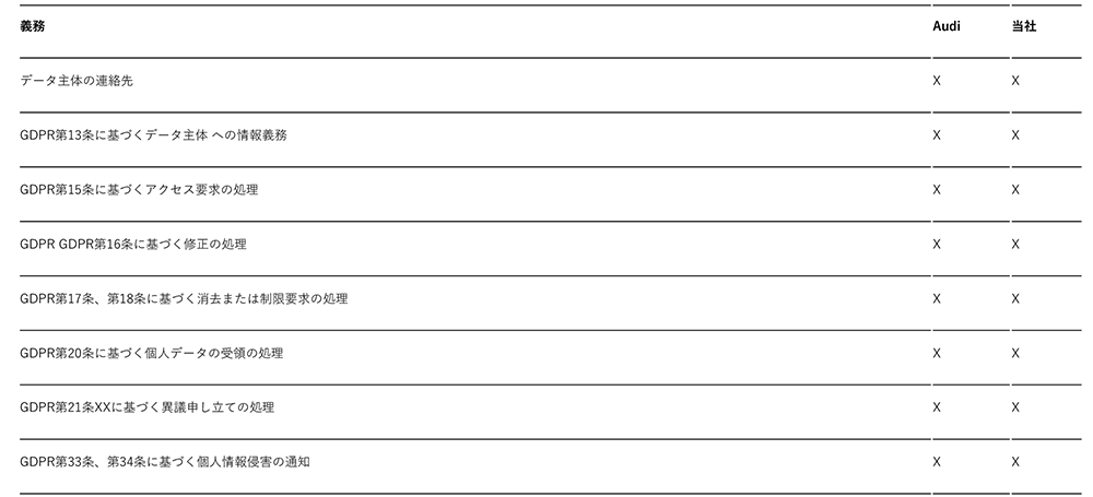 法的要件に従い、当社とAudiは、当社が⼀般データ保護規則(以下「GDPR」) を履⾏し、Audiが以下の事項を定める契約を締結しています。